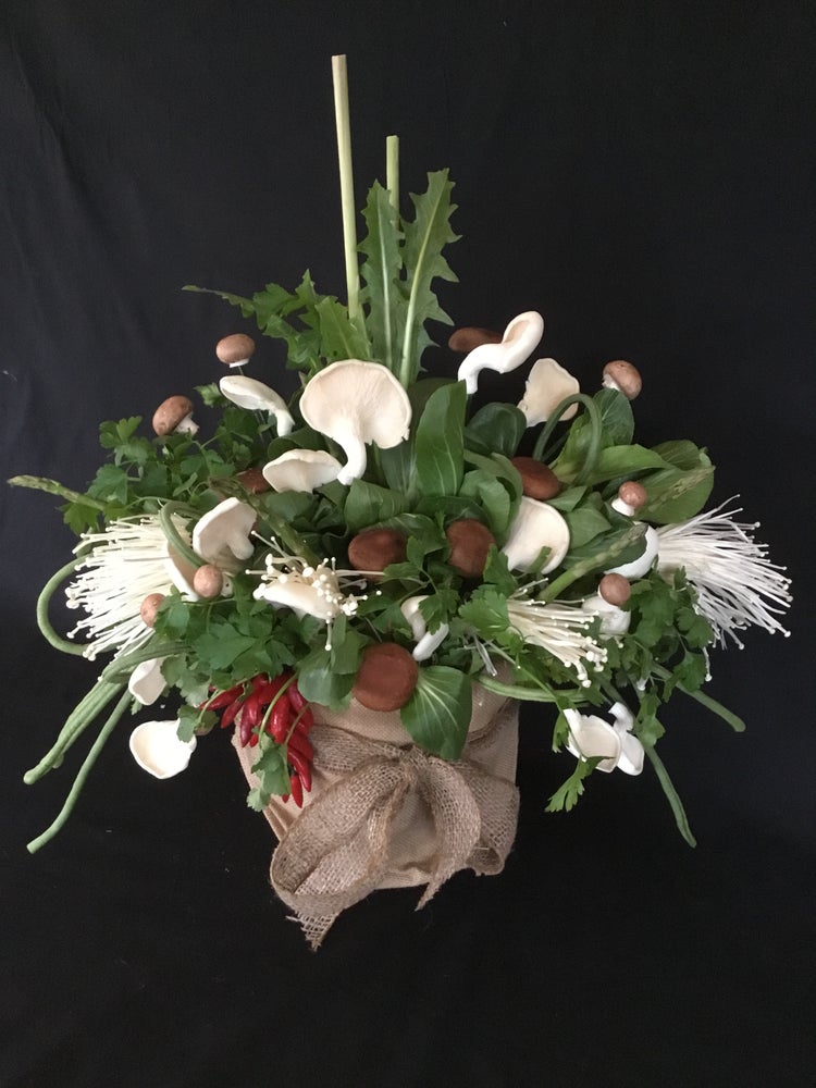 Please note, as we use chemical free and locally grown edible flowers, the type of flowers used may not be identical to the image. The same applies to the fruit, vegetables and herbs - we use only the freshest and highest quality produce in season in our bouquets.