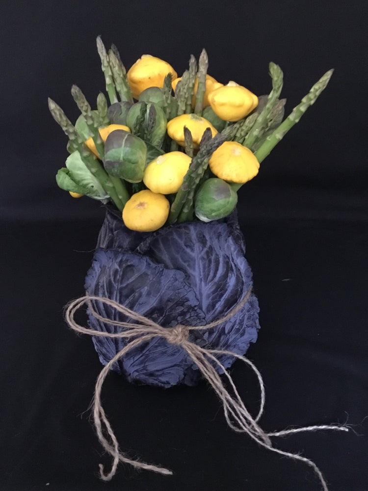 This cheerful yellow and muted purple edible bouquet features, mini squash, brussels sprouts, and asparagus - a perfect combination of colours and flavours.