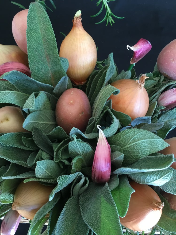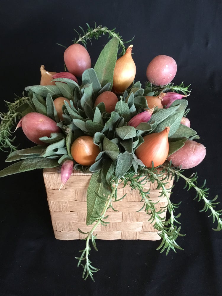 A cute basket bouquet comprising Sage, rosemary, onions, garlic and potatoes - all ready for a Sunday roast!!