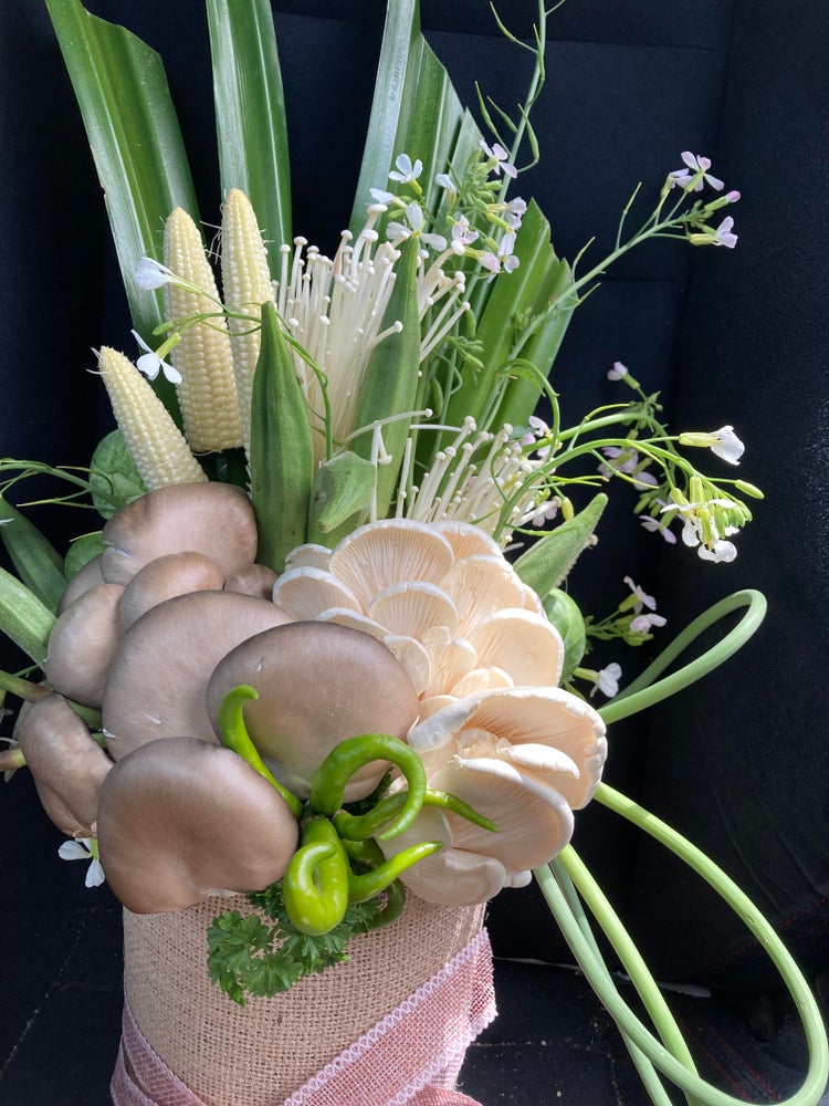 Please note, as we use chemical free and locally grown edible flowers, the type of flowers used may not be identical to the image. The same applies to the fruit, vegetables and herbs - we use only the freshest and highest quality produce in season in our bouquets.
