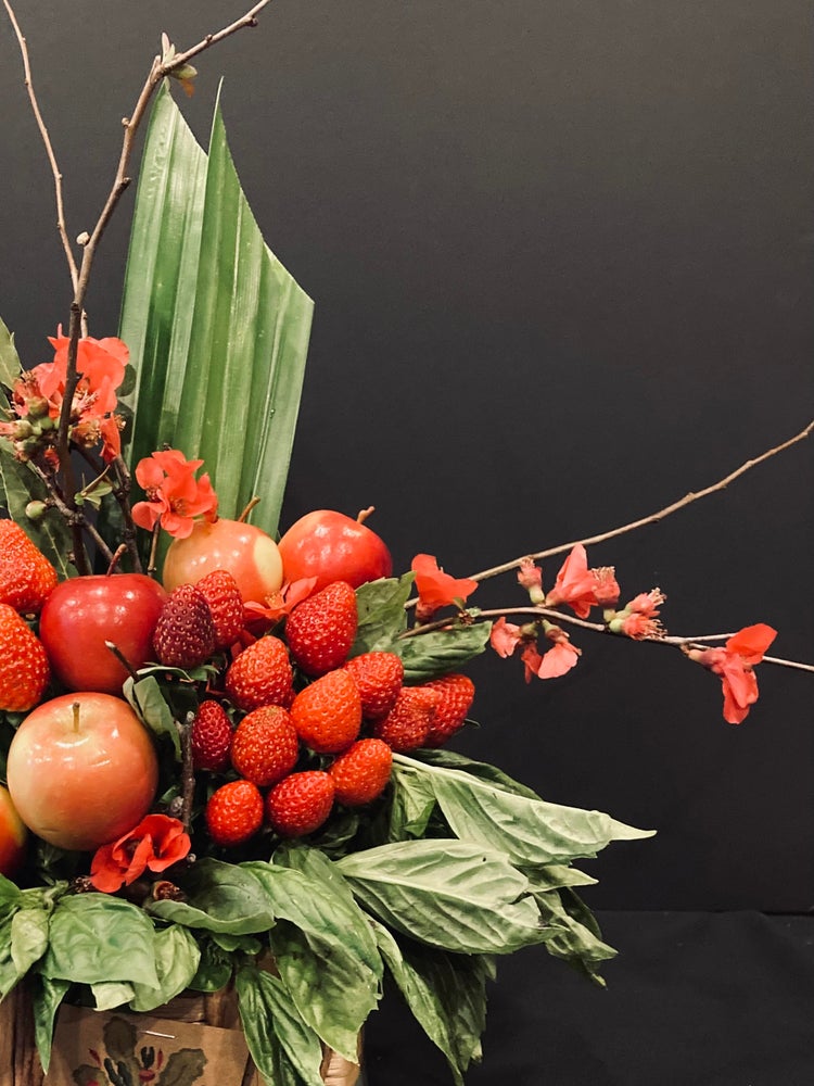 A combination of delicious red summer fruits and aromatic herbs, skillfully arranged to create a stunning display for any occasion.