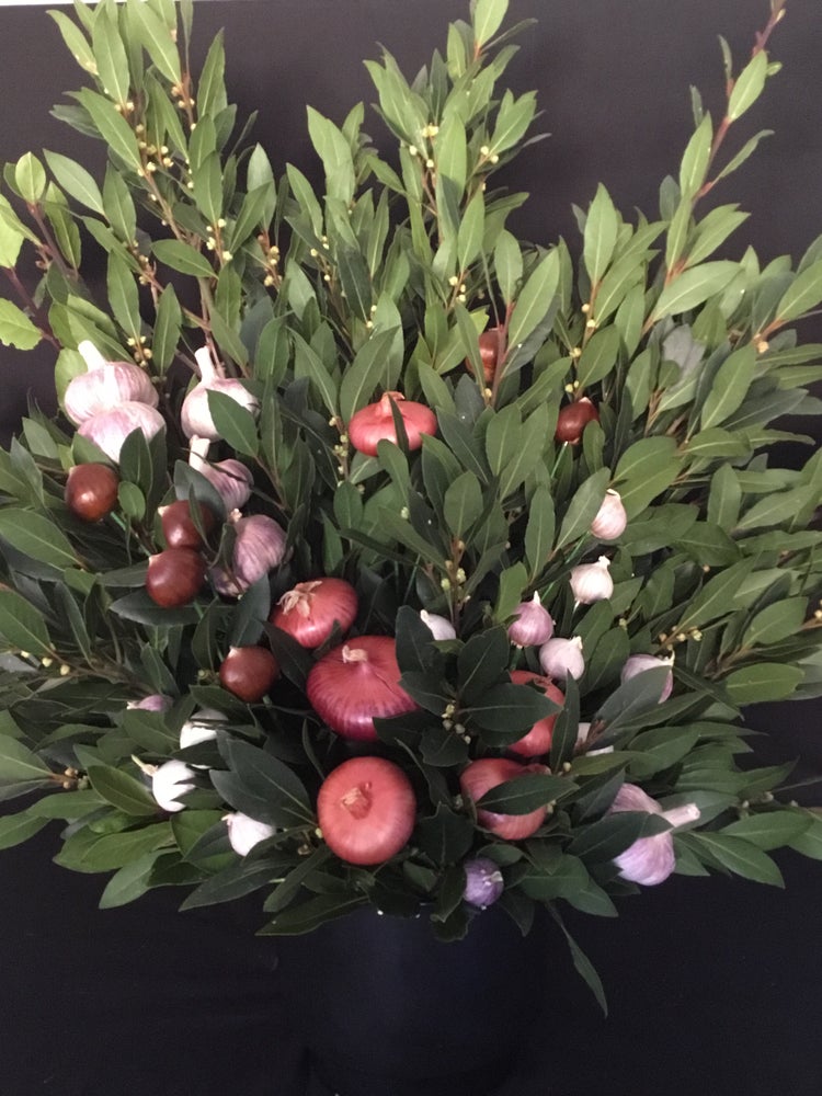 A beautiful bouquet blended together with branches of bay leaves, garlic, baby onions, red onions and chestnuts.